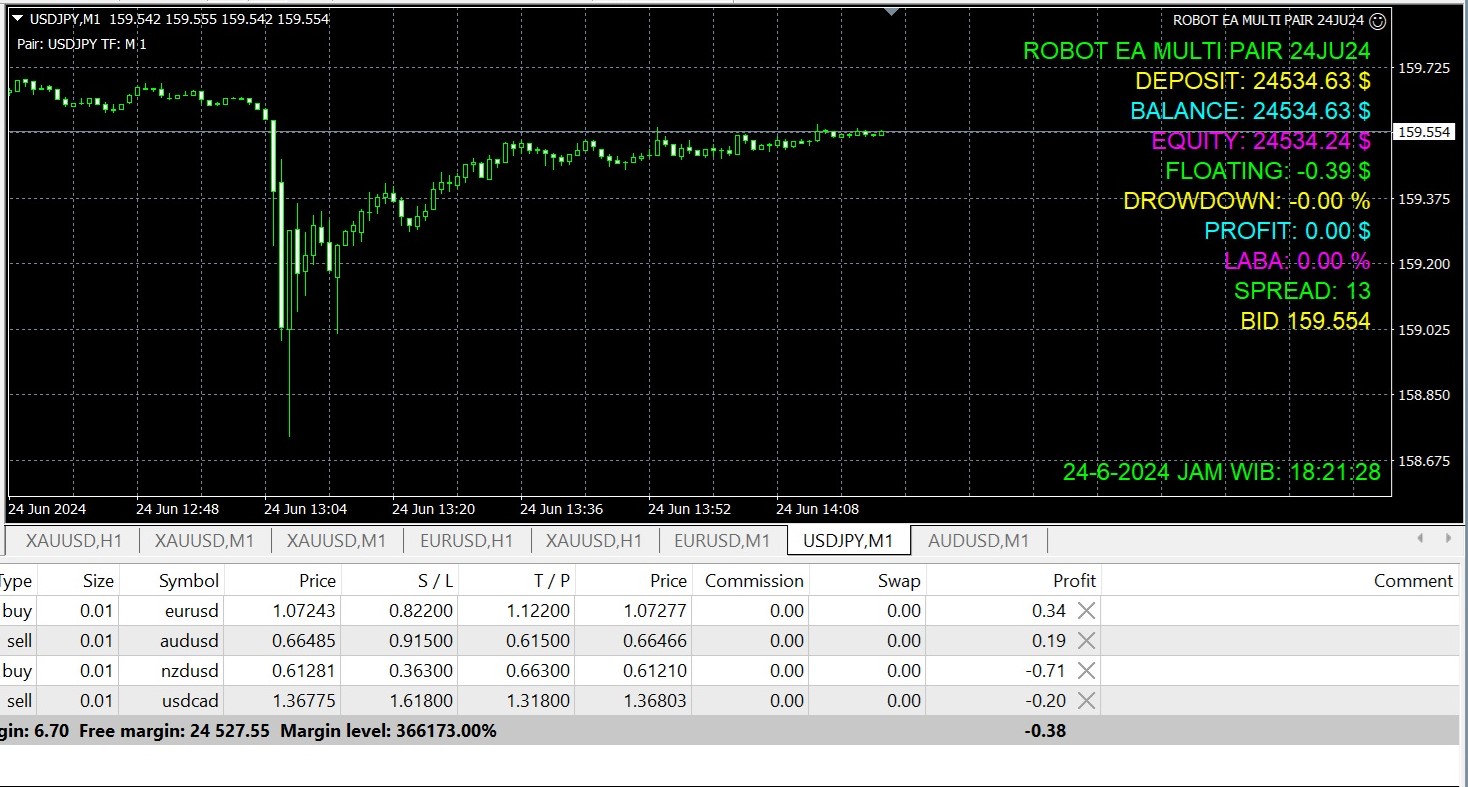 Robot EA Multi Pair 24JU24. Robot Forex Ini Dapat Melakukan Transaksi Buy atau Transaksi Sell Di 7 Pair Yang Berbeda Walaupun Expert Advisor Hanya di Pasang di 1 Chart Misalkan Grafik Forex USDJPY M1.
